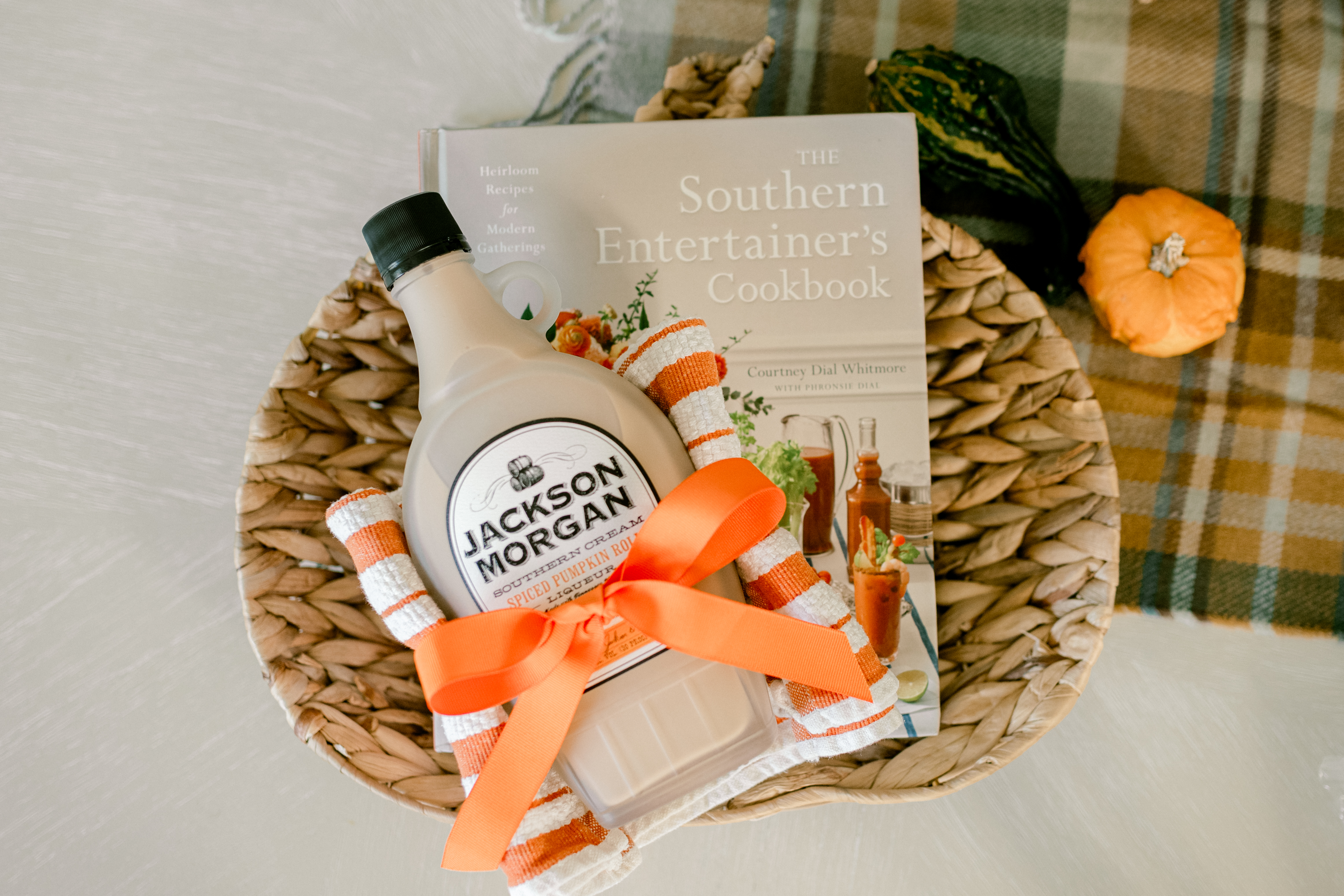 My personal top pick is a high quality cookbook such as Courtney Whitmore’s “The Southern Entertainer’s Cookbook”, which is among my current favorites. While thumbing through the heirloom recipes, set her up with a satisfying drink to sip on. After all, at the conclusion of a social occasion like Thanksgiving, a dose of peaceful solitude is in order. Jackson Morgan Southern Cream in Spiced Pumpkin Roll can be enjoyed solo when post-party rest and relaxation are priority. Tie together a full size bottle and a pretty patterned dish towel with bright ribbon. A festive serving plate or tray makes a fun functional base to combine the gift items. This adorable pumpkin-shaped rattan tray was a perfect find that I was thrilled to share.
