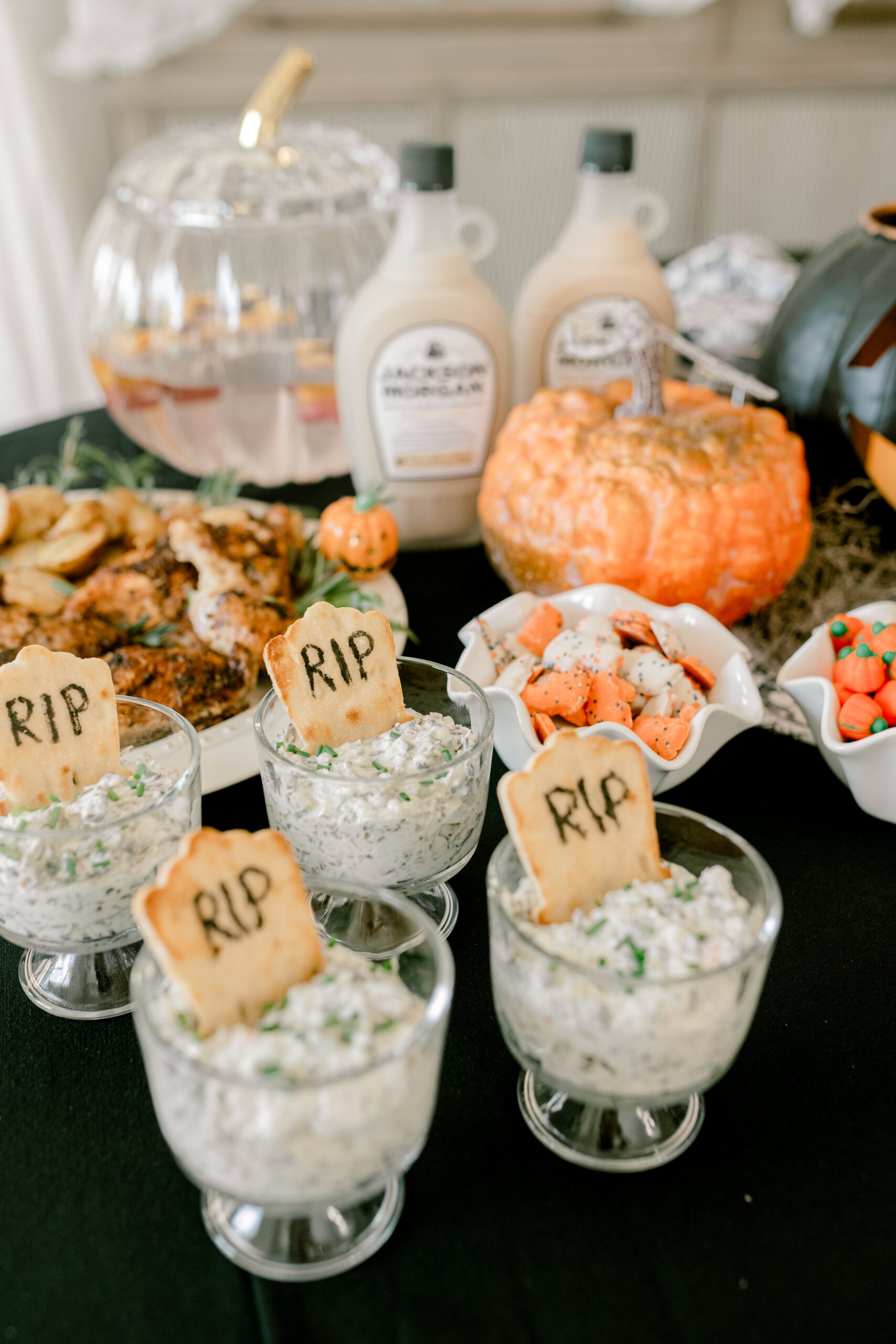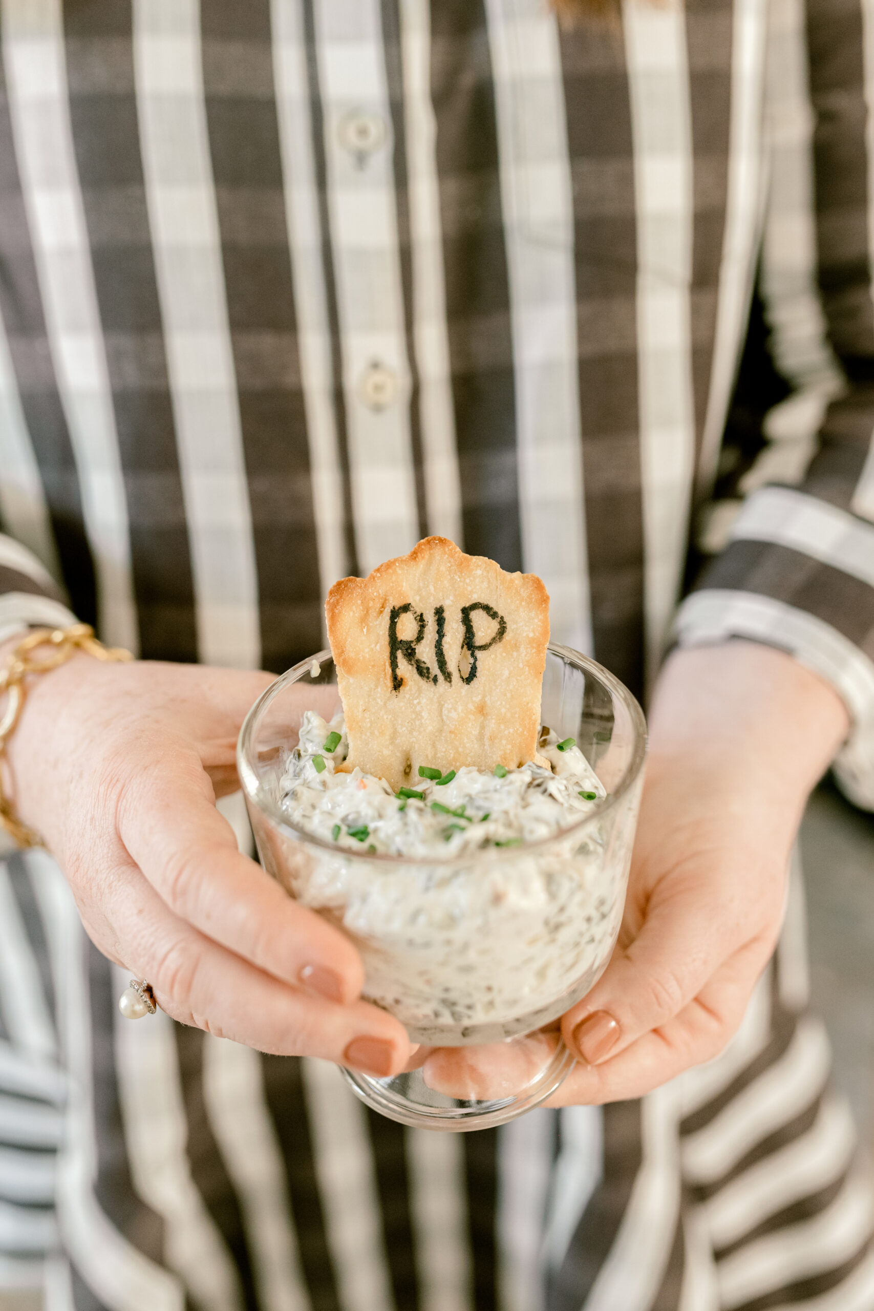 Spinach Dip with Gravestone “RIP” Crackers (use a food safe marker to write RIP)