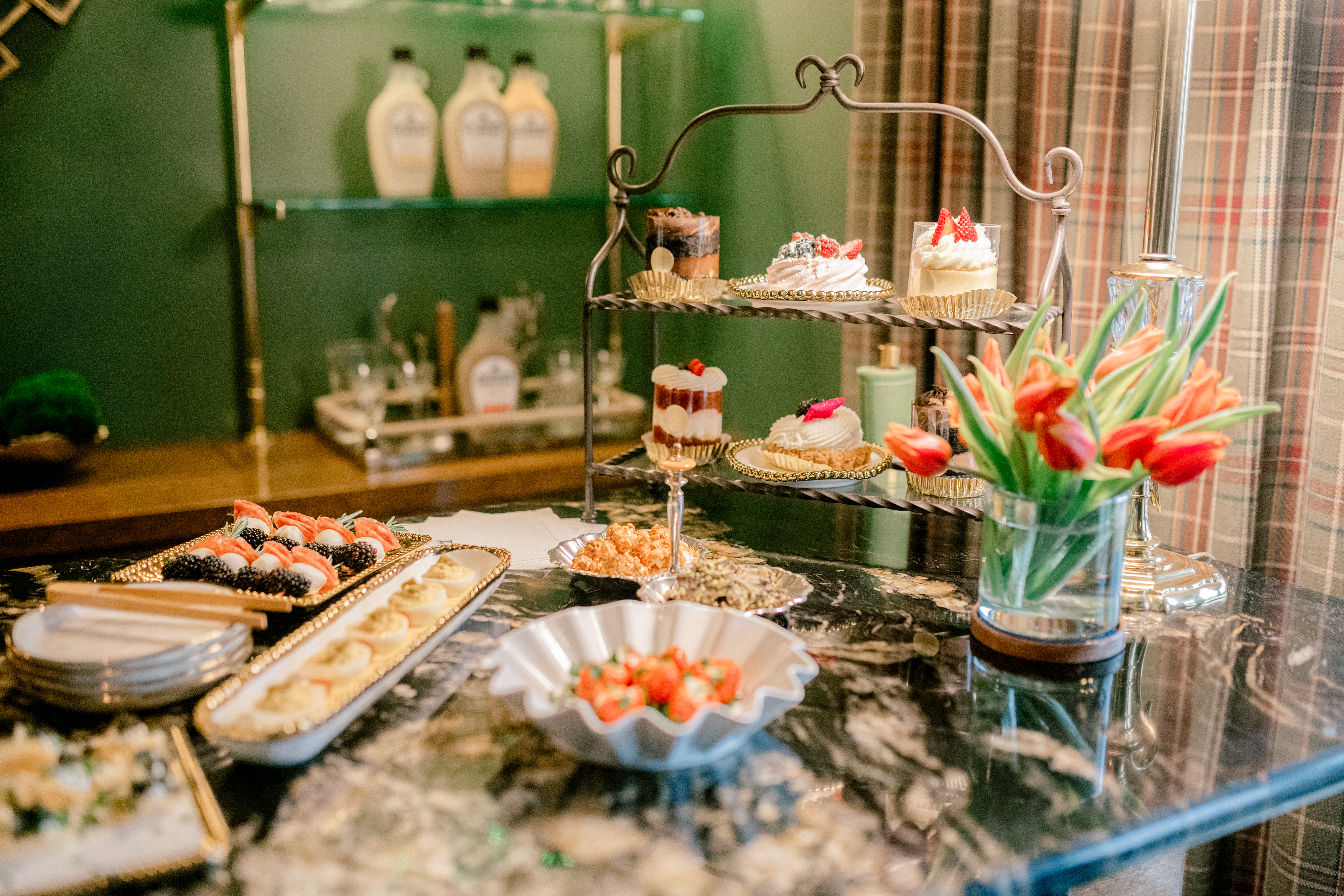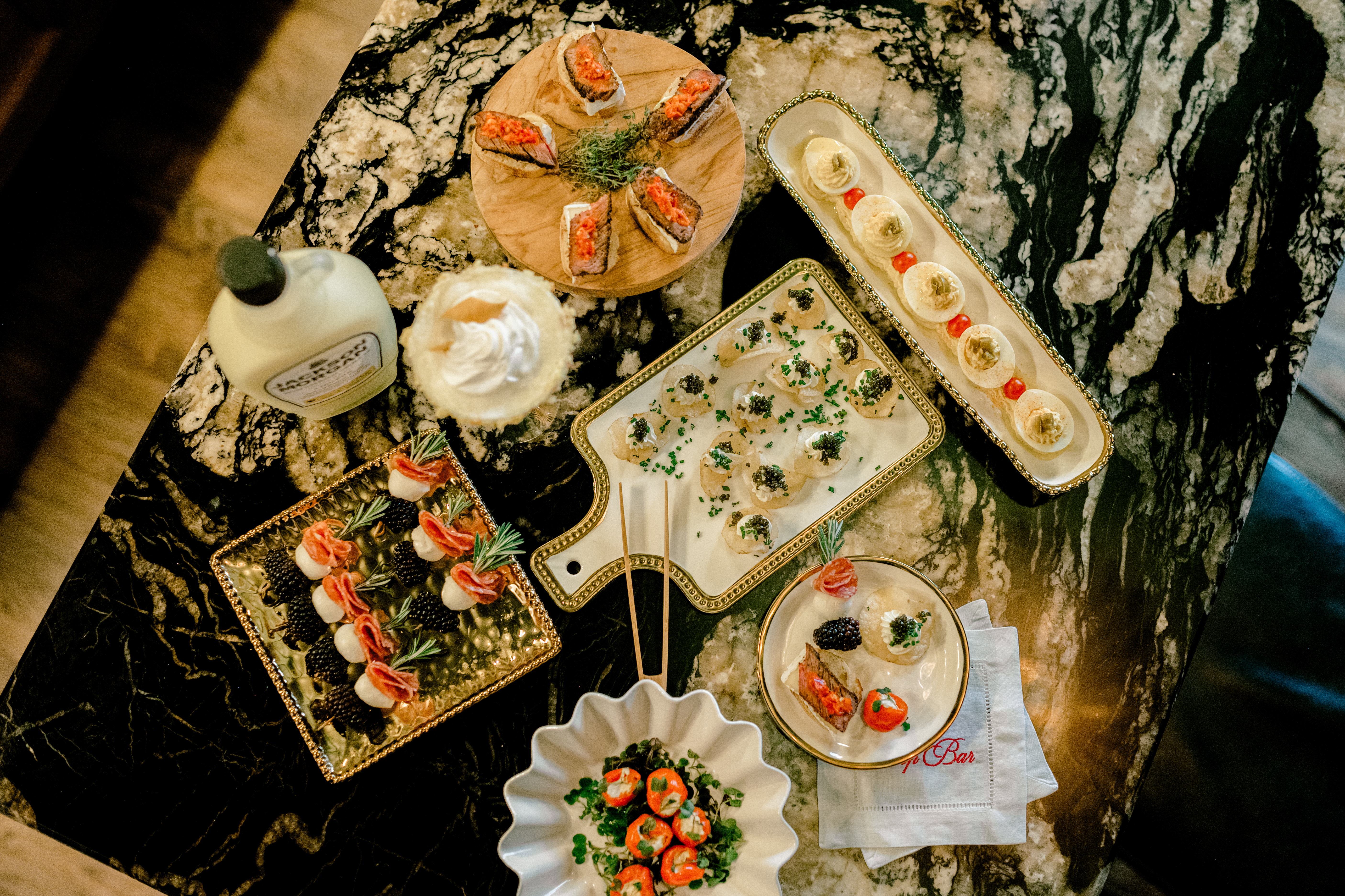 A bowl of unexpected garnishes (think chocolate-covered espresso beans or mini bottles of Jackson Morgan)