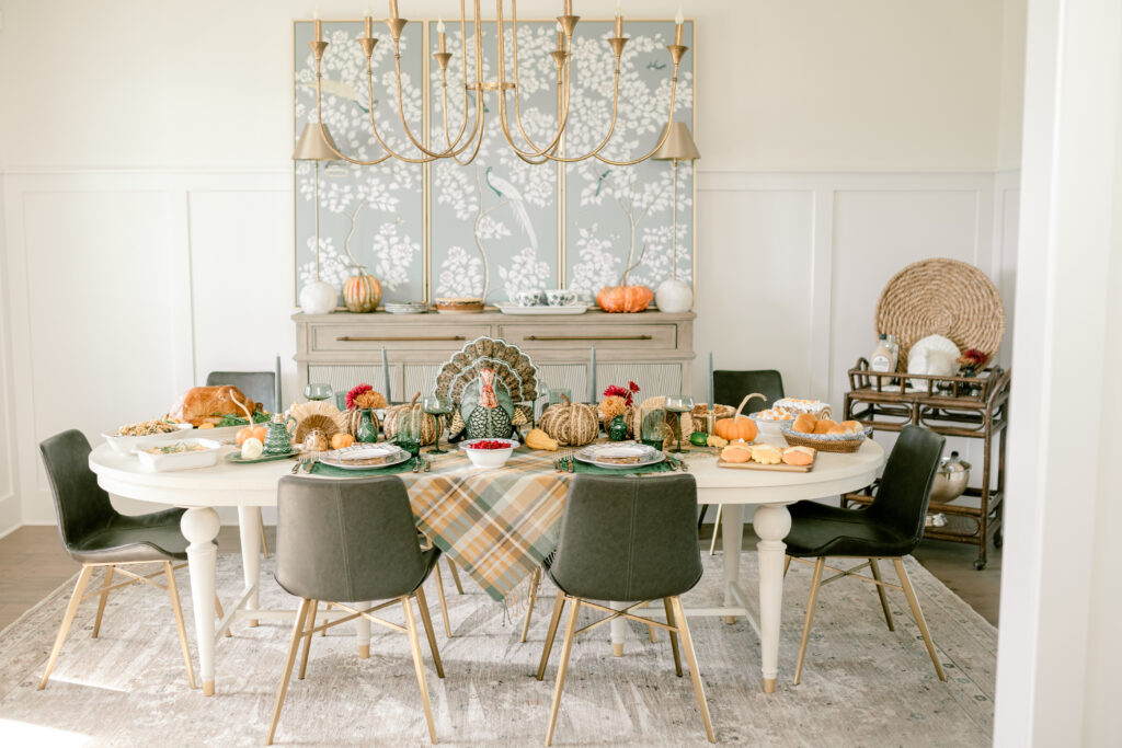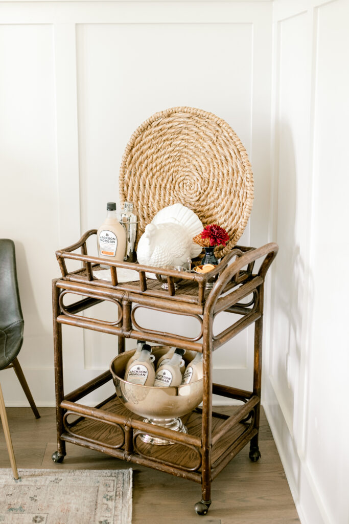 To keep your Thanksgiving theme cohesive, reflect similar elements from the table on the bar cart. A rattan piece of art creates an interesting backdrop and links the neutral aspects….