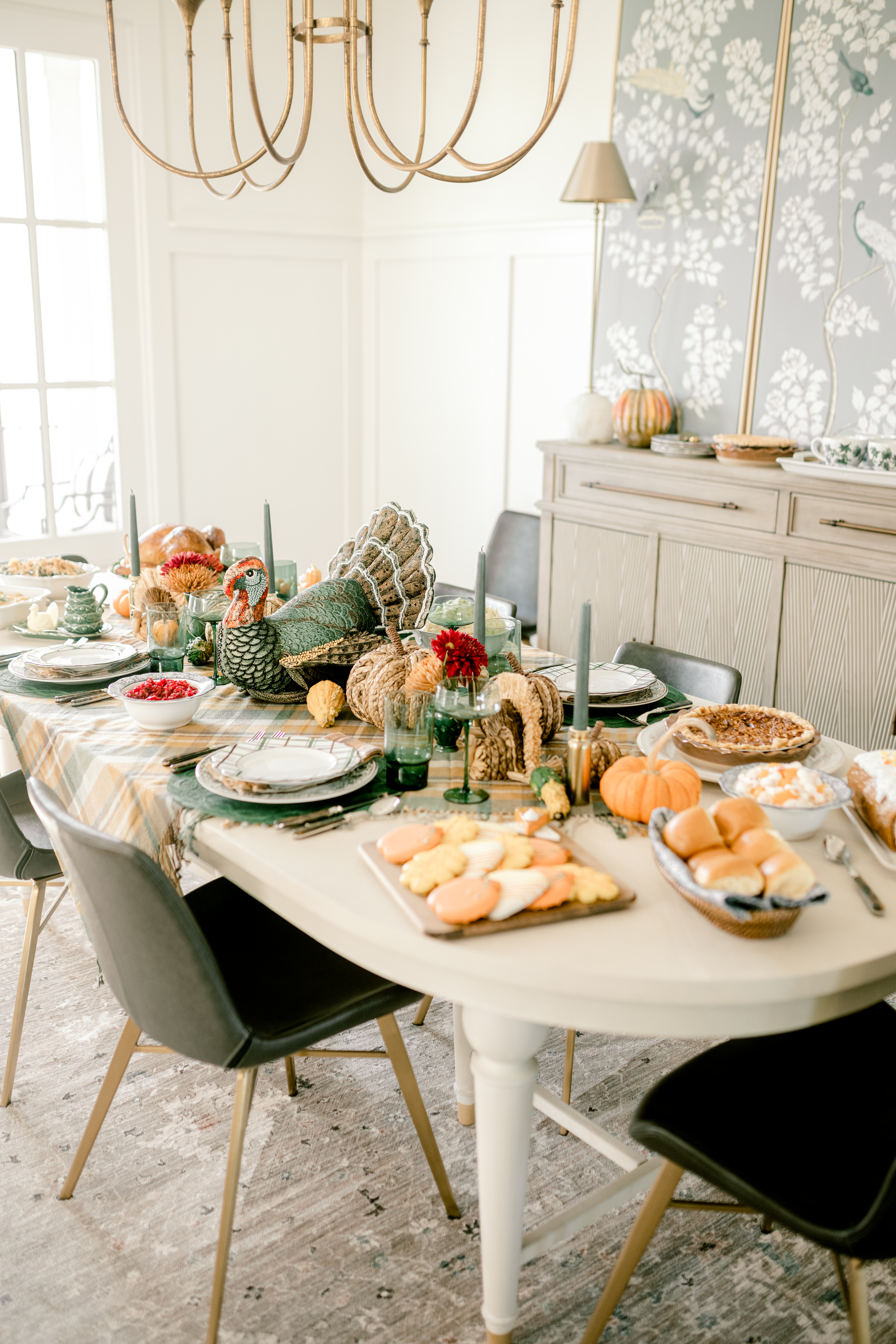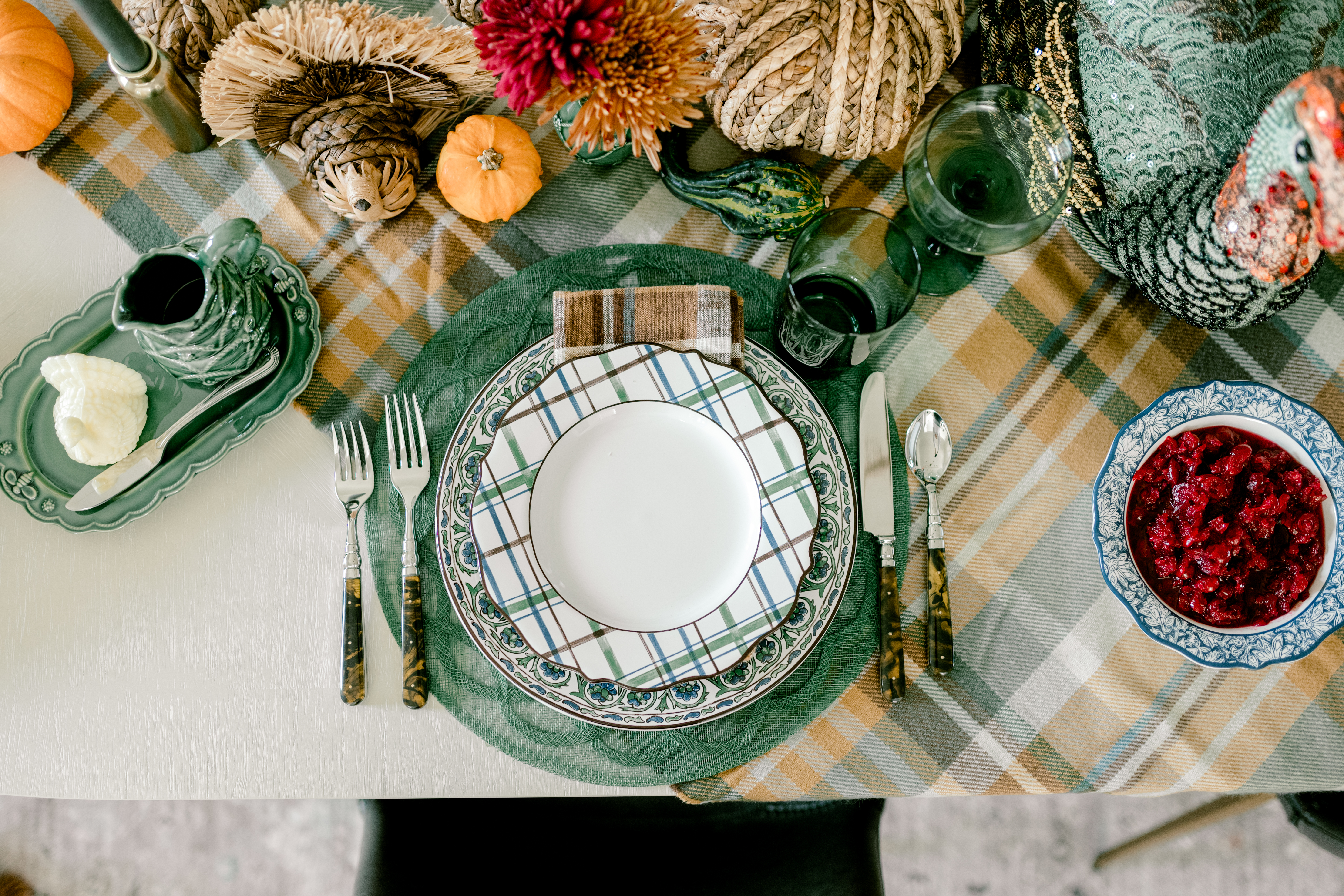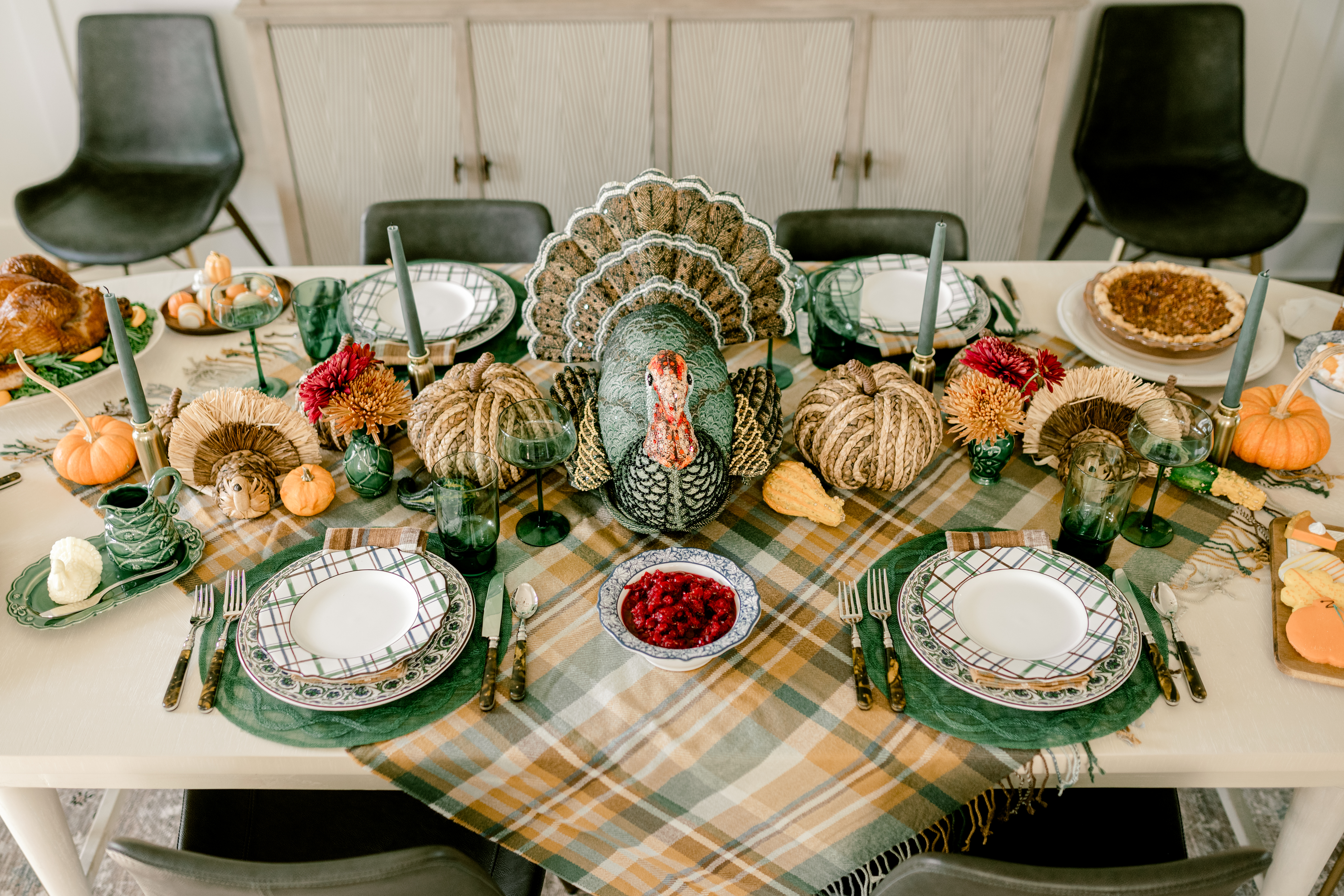 The rich, vibrant hue of emerald green has forever been one of my favorite colors, but I especially adore it during fall. Its ideal intensity pairs perfectly with other jewel-toned color family members like topaz, amber, and garnet. When I came across this incredible and unique turkey centerpiece, it instantly became the inspiration behind the theme for Thanksgiving this year. Fresh white plates with subtle windowpane plaid adorned rims, alongside tortoise flatware, emerald glassware, all balanced on a plaid tablecloth with matching napkins create the eye-pleasing yet functional aspect of the table spread.