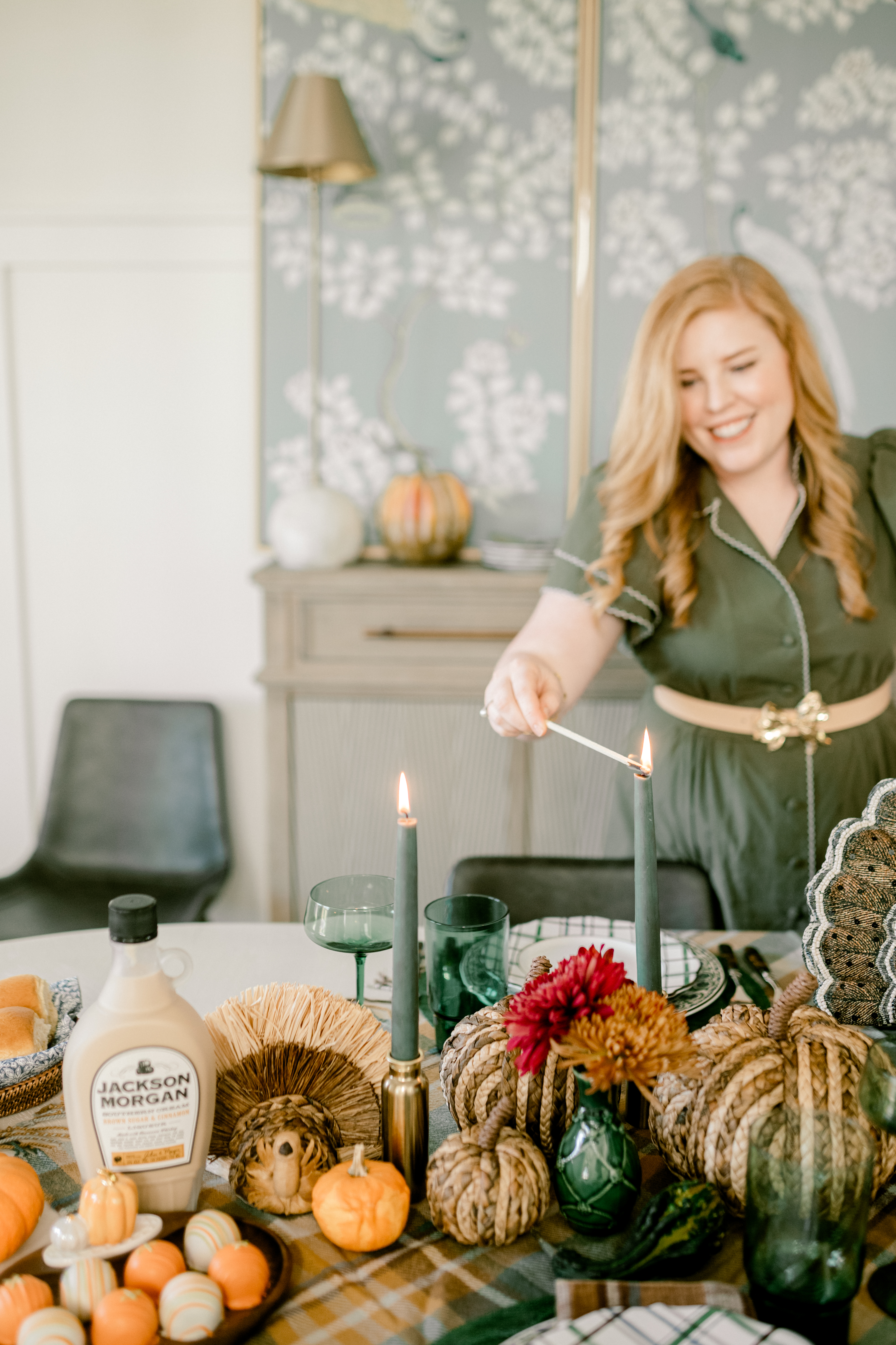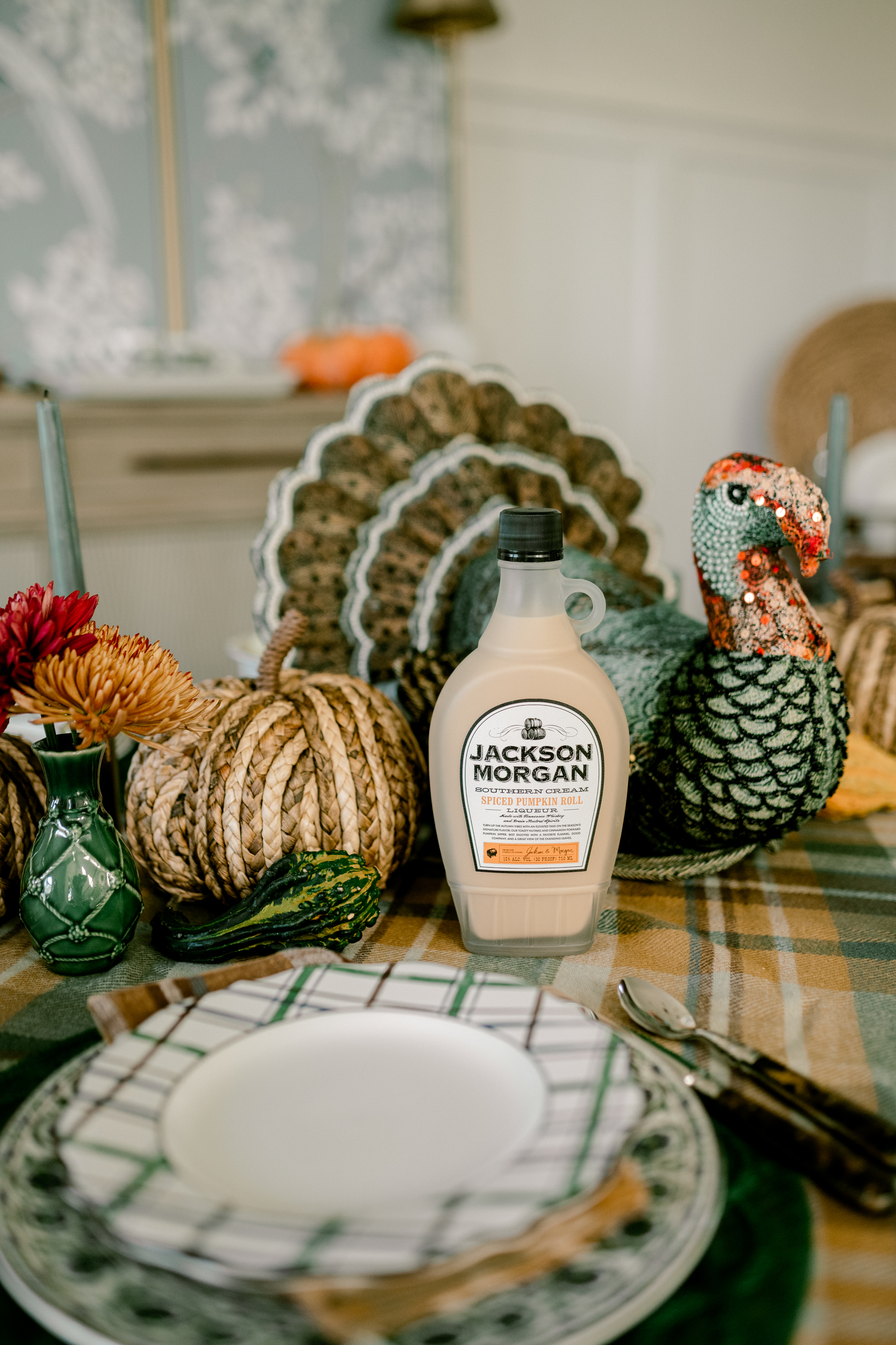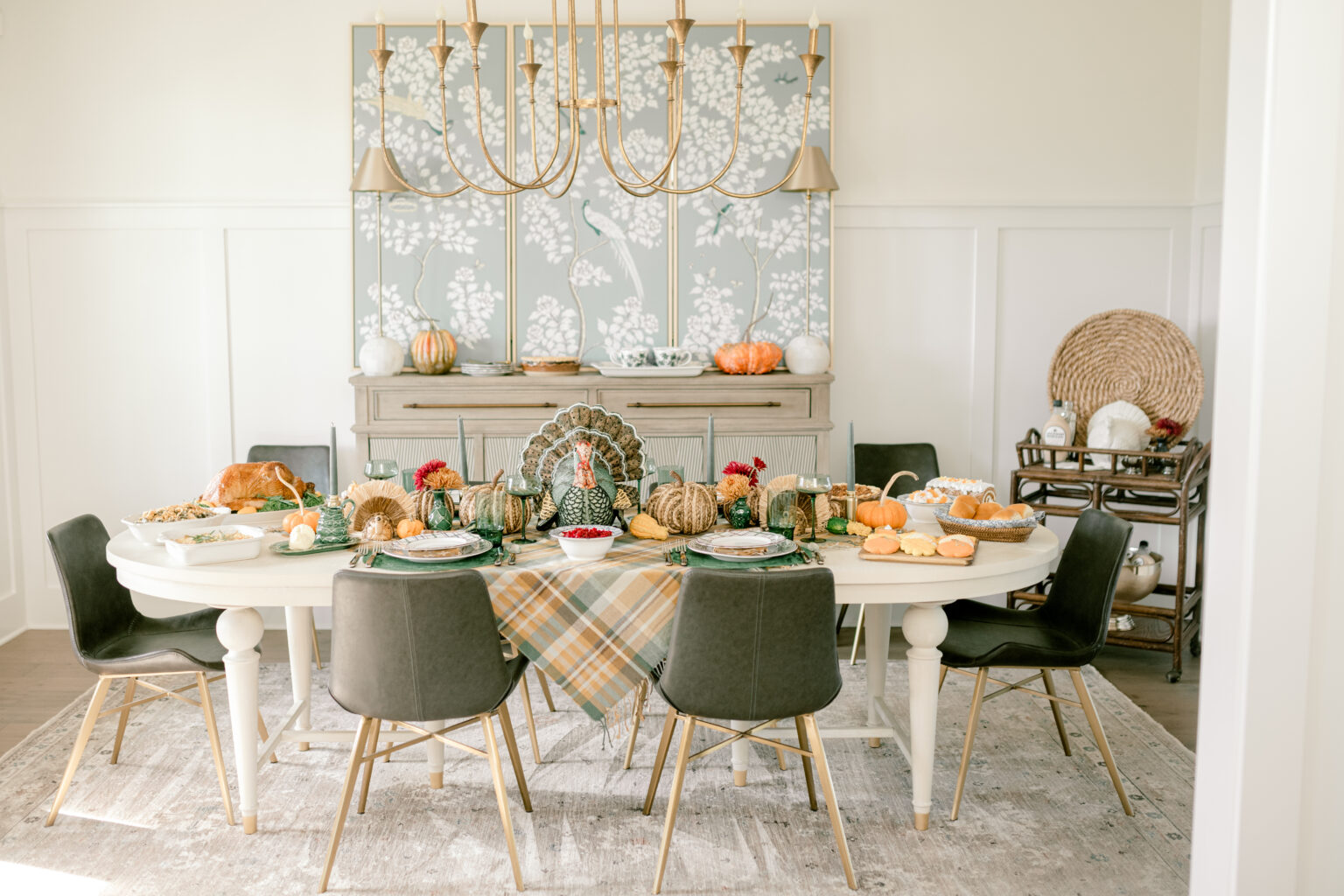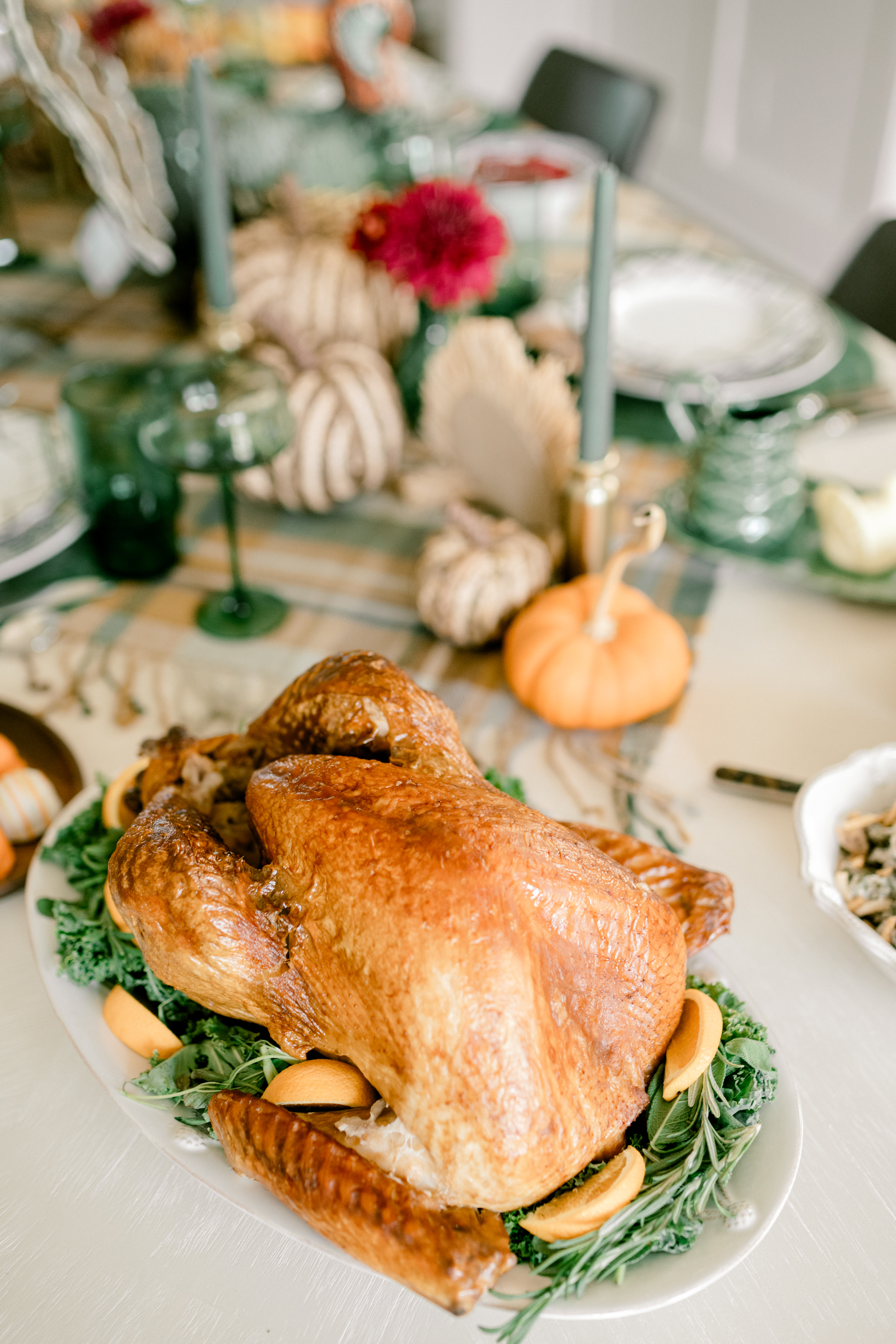 The rich, vibrant hue of emerald green has forever been one of my favorite colors, but I especially adore it during fall. Its ideal intensity pairs perfectly with other jewel-toned color family members like topaz, amber, and garnet. When I came across this incredible and unique turkey centerpiece, it instantly became the inspiration behind the theme for Thanksgiving this year. Fresh white plates with subtle windowpane plaid adorned rims, alongside tortoise flatware, emerald glassware, all balanced on a plaid tablecloth with matching napkins create the eye-pleasing yet functional aspect of the table spread.